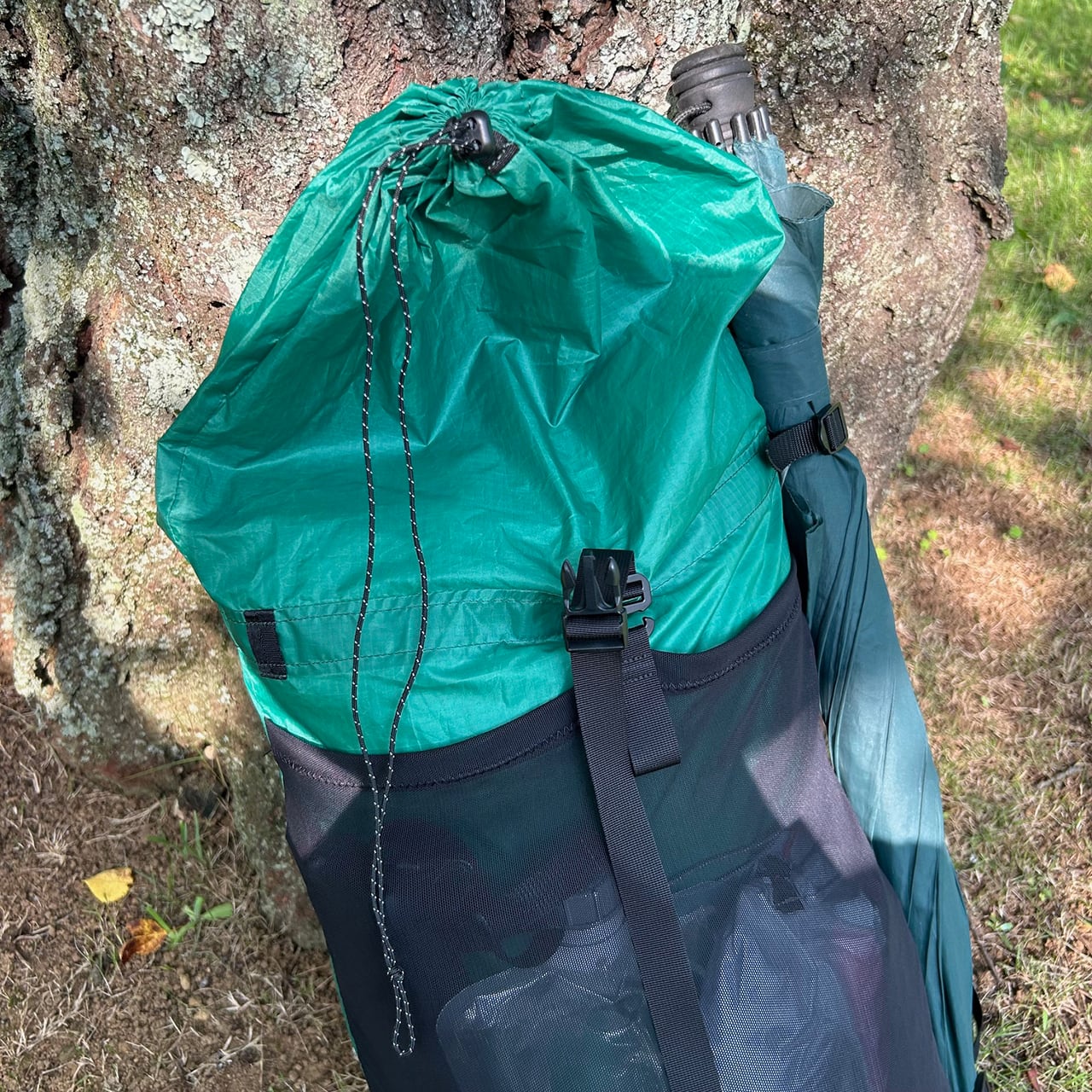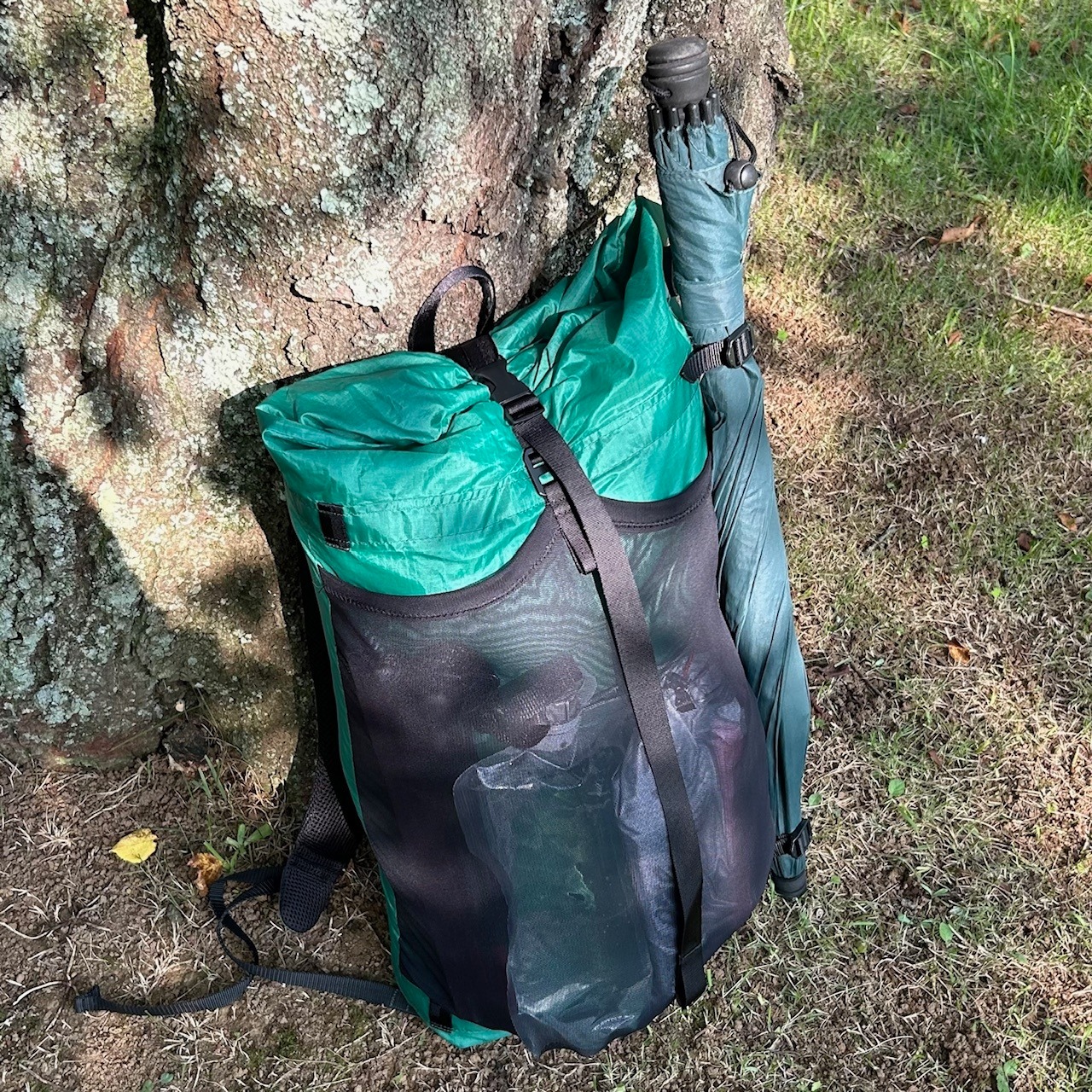 当然、背面パッドも付いていません。薄手のスリーピングマットやウレタンマットを背面側に入れパッキングする構造です。前面のメッシュポケットが浅い分、左右上下に計4か所のストラップ用ループを設けてあります(ストラップ2個付属)。ユーザーさま自身が工夫し、長傘、ストックなどのパッキングに使用してください。